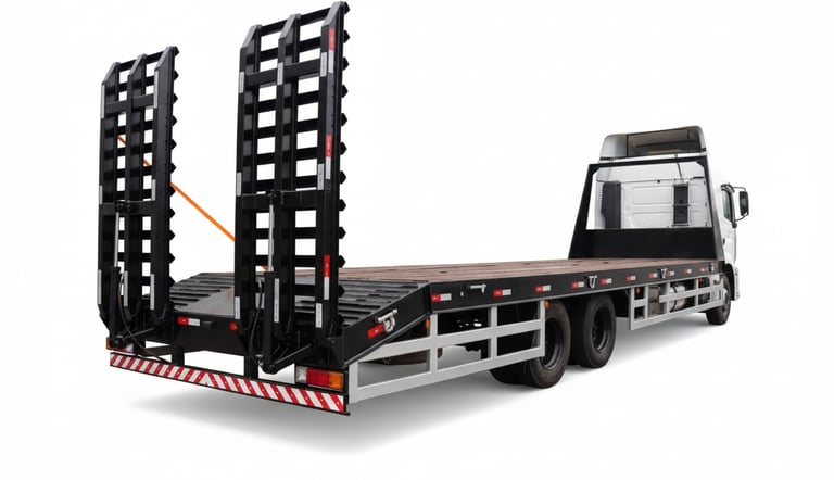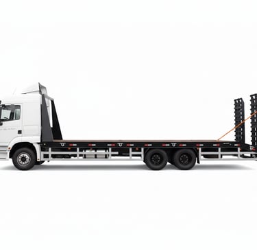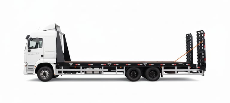 ➥Capacidade de Carga: Variável, conforme a configuração do chassi do caminhão, projetada para o transporte seguro de máquinas pesadas, sendo até 35 toneladas.
